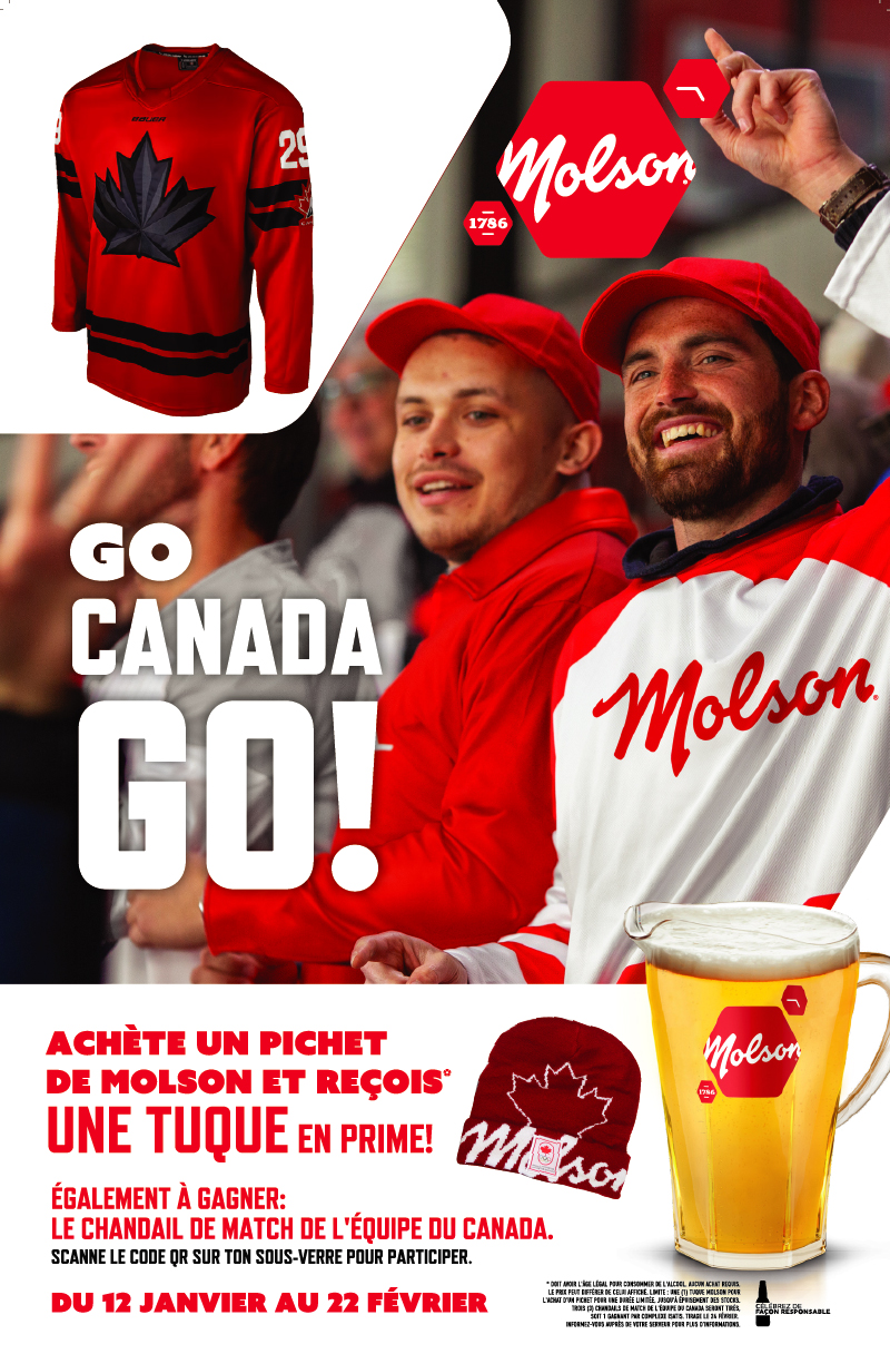 À l’achat d’un pichet Molson Ex, Molson Canadian ou Coors Light, tu recevras ta tuques authentique Molson ds Olympiques!